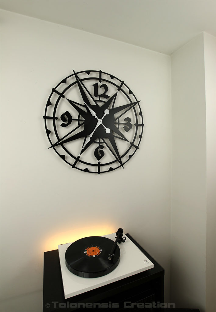 L’horloge exotique Colombus offre une très belle composition articulée autour d’un grand cadran en forme de rose des vents et encadrée de chiffres romains. Ce graphisme qui rappelle les instruments de navigation et les cartes maritimes s’intègre à merveille dans de très nombreux type de décorations intérieures.